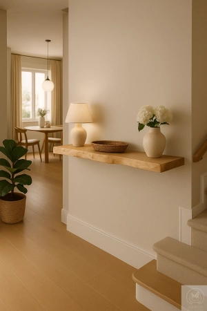 Konsola dębowa na ścianę 80–100 cm, wisząca na ukrytych wspornikach, naturalna krawędź live edge, aranżacja z wazonem w jasnym holu Konsola dębowa na ścianę 80–100 cm z litego dębu, wisząca w przedpokoju, jasne ściany, lustro i dekoracje w stylu premium Konsola dębowa na ścianę 80–100 cm, widok z perspektywy 3/4, gruby blat 4 cm, nieregularna krawędź, detal słojów dębu Konsola dębowa na ścianę 80–100 cm, wieczorna aranżacja z lampą stołową, wisząca na wspornikach w eleganckim holu