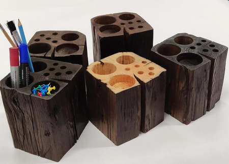 - Przybornik na biurko ze starego drewna to drewniany organizer na długopisy i akcesoria, wykonany z litego drewna sosnowego z rozbiórki. Każdy egzemplarz ma unikalny rysunek i kolor, a olejowane wykończenie podkreśla charakter materiału.