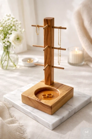 Minimalistyczny, a przy tym bardzo praktyczny organizer na biżuterię z litego drewna to wygodny sposób, by trzymać kolczyki, bransoletki i łańcuszki zawsze pod ręką. Prosta forma, piękny rysunek drewna i solidne wykonanie sprawiają, że stojak pasuje do wnętrz nowoczesnych, klasycznych i premium. W podstawie znajduje się miseczka z żywicy epoksydowej – idealna na pierścionki i drobiazgi.
