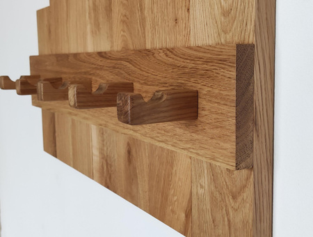 - Dębowy wieszak ścienny na ubrania z kołkami z litego dębu to stabilna, wyrazista forma na ścianę. Sprawdza się jako wygodne miejsce na codzienne okrycia i dodatki.